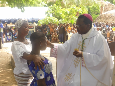 L’évêque de Sokodé, Son Excellence Mgr Célestin-Marie GAOUA a conféré le sacrement de confirmation à 159 néophytes au cours d’une célébration eucharistique à la Paroisse St Joseph d’Adjengré dimanche 4 mai 2025. Venus des cinq paroisses du doyenné du Mono à savoir St Joseph Artisan d’Adjengré, Notre Dame de Lourdes de Lama Tessi, St Paul d’Aou-Mono, Ste Rita de Sessaro-Mazada et Sacré-Cœur de Jésus d’Aouda, ils étaient des milliers de fidèles à participer à cette célébration eucharistique qui marquait également l’apothéose des Journées de la Jeunesse.