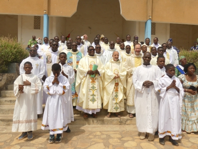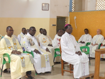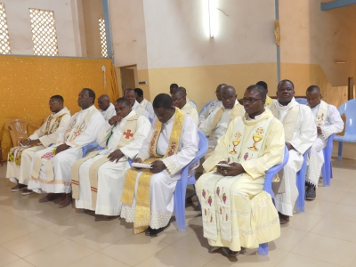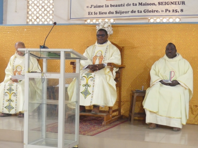 Celle-ci fut présidée par Mgr Célestin-Marie GAOUA, l’évêque de Sokodé. Il était entouré d’une quarantaine de prêtres dont le Vicaire général, le TRP Michel MAMA-BETRE et le Vicaire épiscopal, le TRP Alfred PIGNAN. L’officiant a introduit sa méditation par l’invitation à porter dans la prière l’évêque émérite endormie dans le Seigneur la veille du pèlerinage.